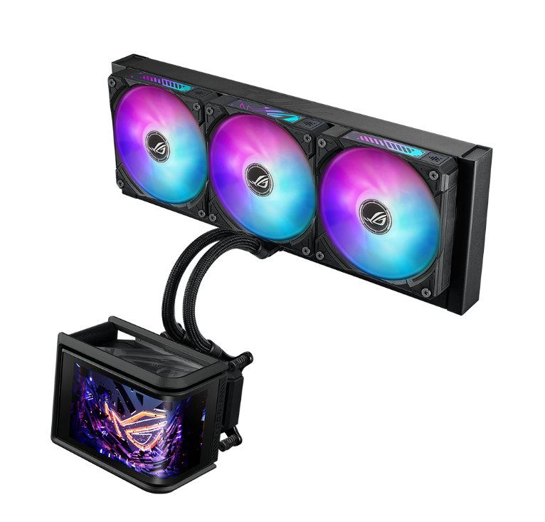 ROG Ryuo IV SLC 360 ARGB 採用縮短的水冷管設計,呈現極簡俐落的美感,搭載可移動曲面 6.67 吋 AMOLED 螢幕,支援裸視影片播放與自訂系統資訊顯示,另配備預裝的串聯式 ARGB 風扇,具備前側與側邊燈效。